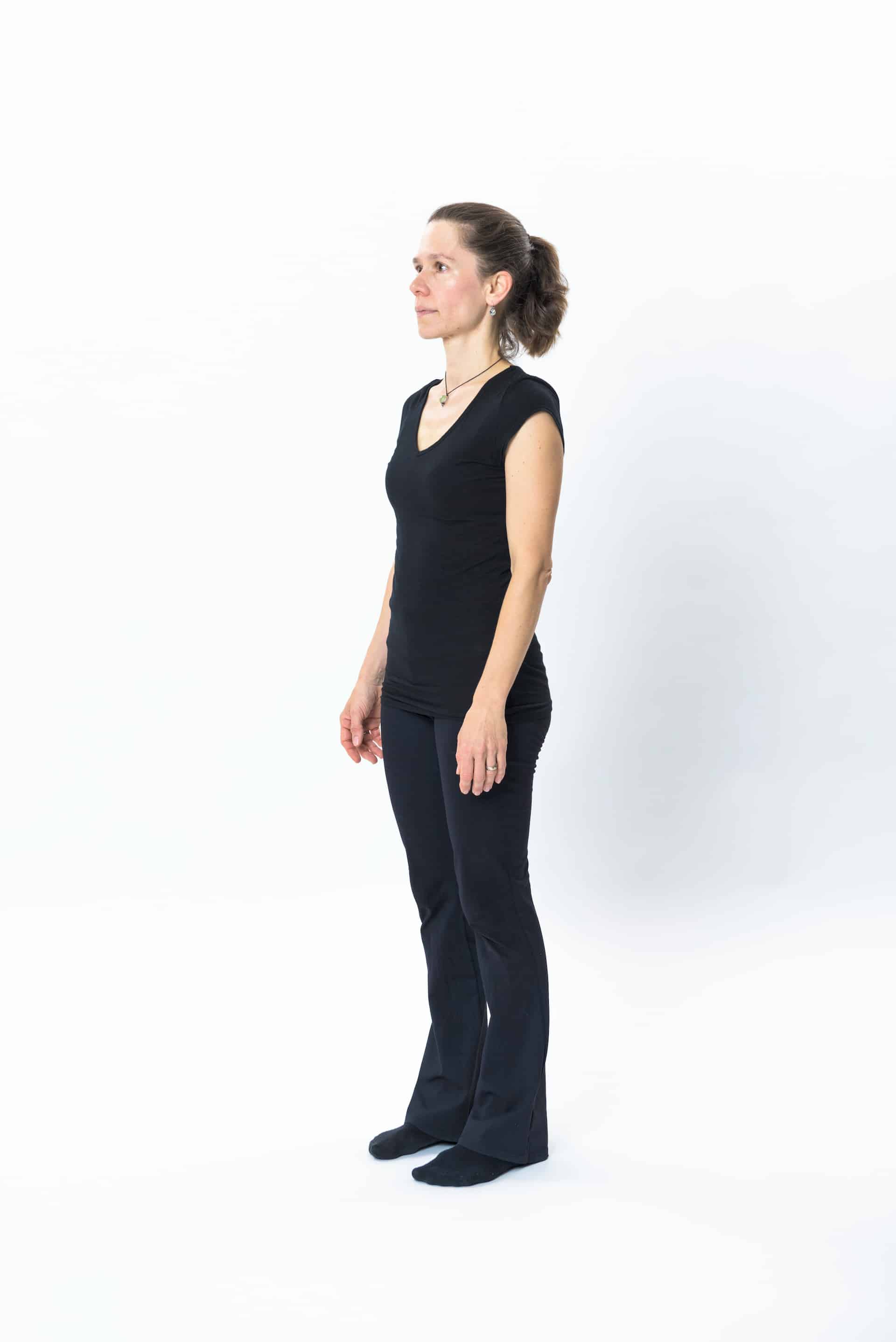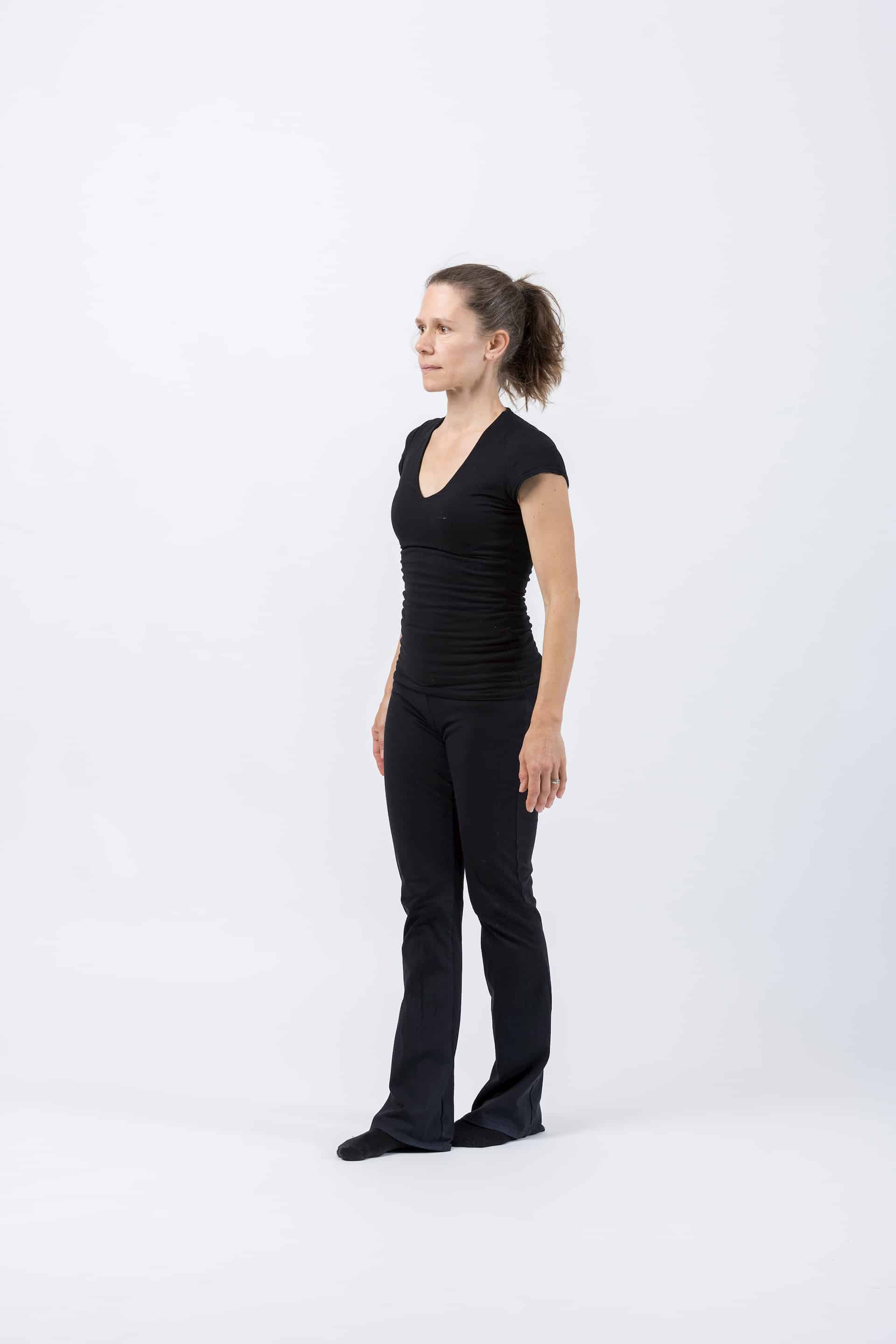 A Stehen. Für diese Stellung gilt dasselbe wie beim Sitzen. Die Wirkung der Schwerkraft auf den Beckenboden ist gut spürbar. Eine gute Haltung ist wichtig. Ich empfehle, regelmässig im Stehen zu üben, da wir den grössten Teil unseres Alltags in vertikalen Positionen verbringen. Beckenbodentraining im Stehen geht (fast) immer und überall. Am Schalter, an der Kasse, beim Zuschauen, beim Warten...
