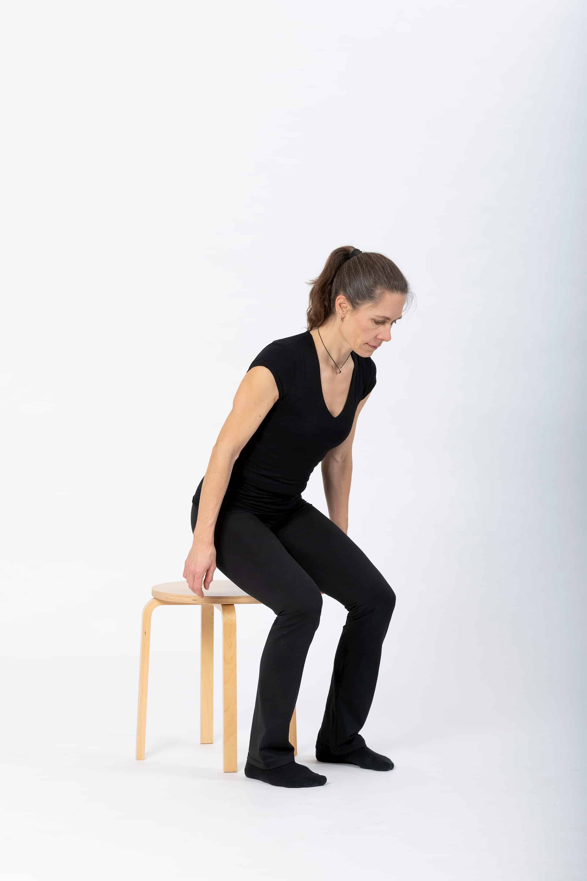 A Sitzen. In dieser Stellung wird der Beckenboden von der Schwerkraft gefordert. Nimm eine gute Haltung ein, damit der Beckenboden wie gewünscht funktionieren kann. Eine gute Haltung einnehmen heisst, die Wirbelsäule sanft in die Länge ziehen, am Hinterkopf nach oben und am Steissbein nach unten. Für manche Frauen bedeutet der Wechsel von einer horizontalen in eine vertikale Ausgangsstellung eine Herausforderung. Beckenbodentraining im Sitzen geht (fast) immer und überall. Am Tisch, im Bus, an einer Sitzung, beim Warten...