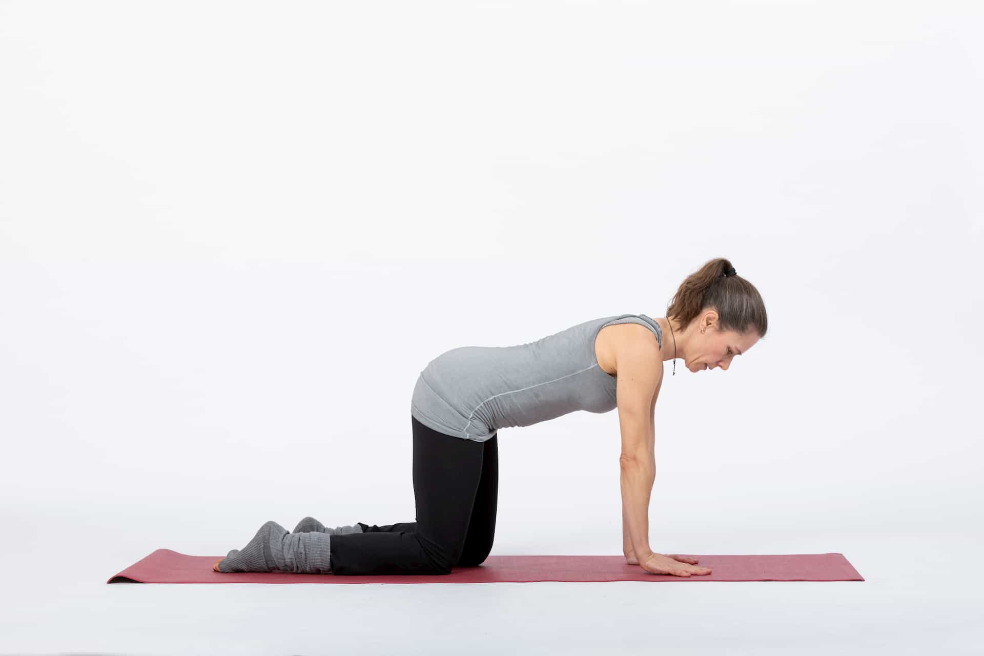 A Unterarmstand. Diese Stellung ist für Frauen mit Organsenkungen besonders zu empfehlen Die Entlastung des Beckenbodens ist noch grösser als im Vierfüssler, weil das Becken höher liegt als der Oberkörper. Im Unterarmstand fällt der Druck auf den Beckenboden nach unten weg und der Bauchraum kann besser entspannt werden.