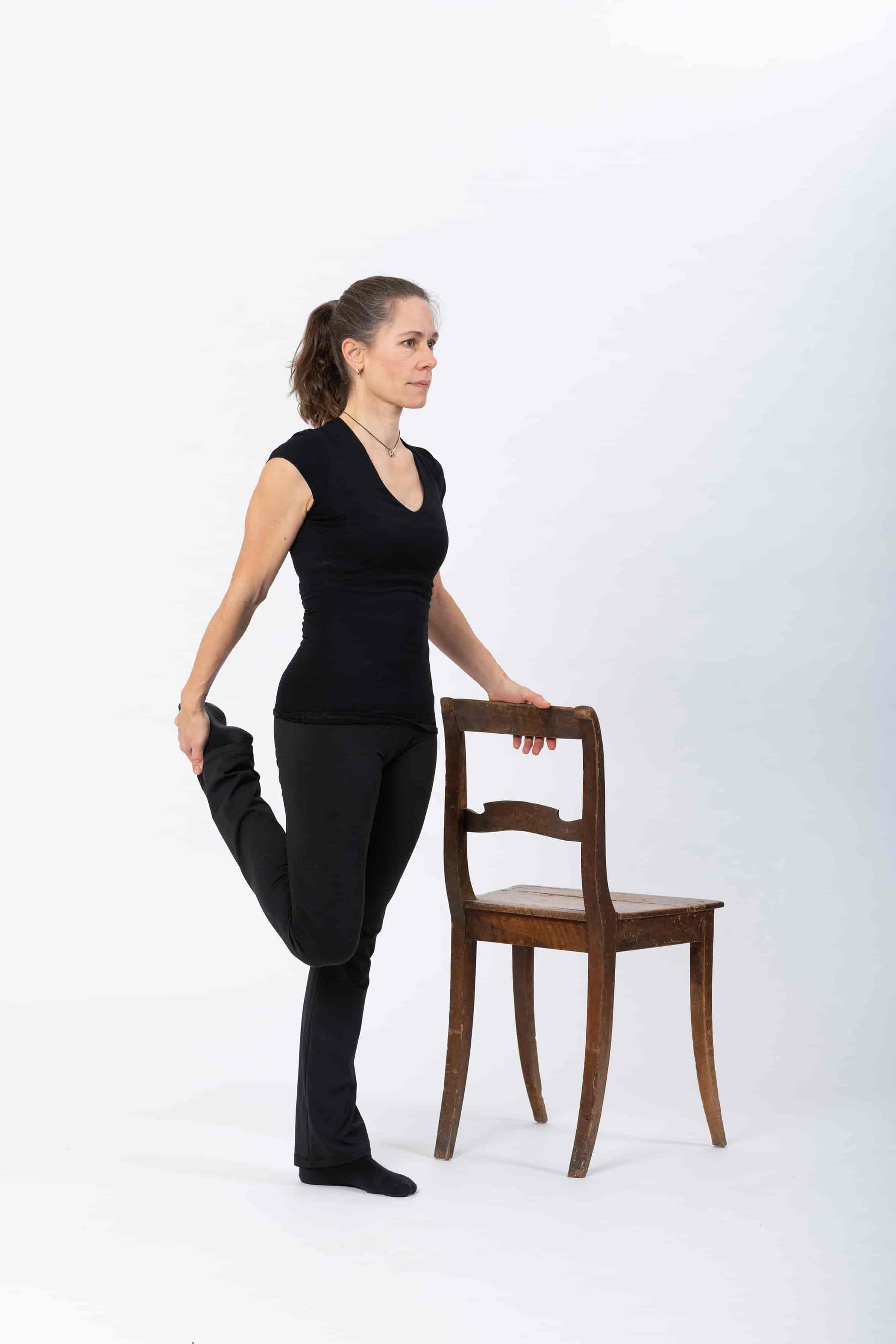 A Dehnung der vorderen Oberschenkelmuskulatur im Stehen. Halte dich an einer Stuhllehne oder an der Wand fest. Fasse mit der anderen Hand den Fuss auf der gleichen Seite. Suche in dieser Stellung ein für dich gut erträgliches Streck-Gefühl im Oberschenkel. Achte dabei auch auf eine gute Streckung in der Leiste. Atme entspannt. Wenn dir das Fassen des Fusses Mühe macht, kannst du ein Tuch zu Hilfe nehmen. Lege das Tuch ums Fussgelenk und ziehe den Fuss am Tuch nach oben.