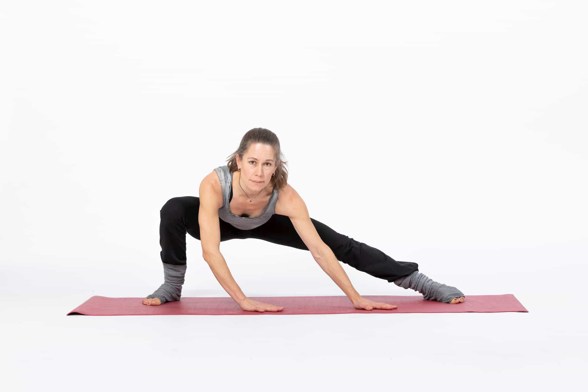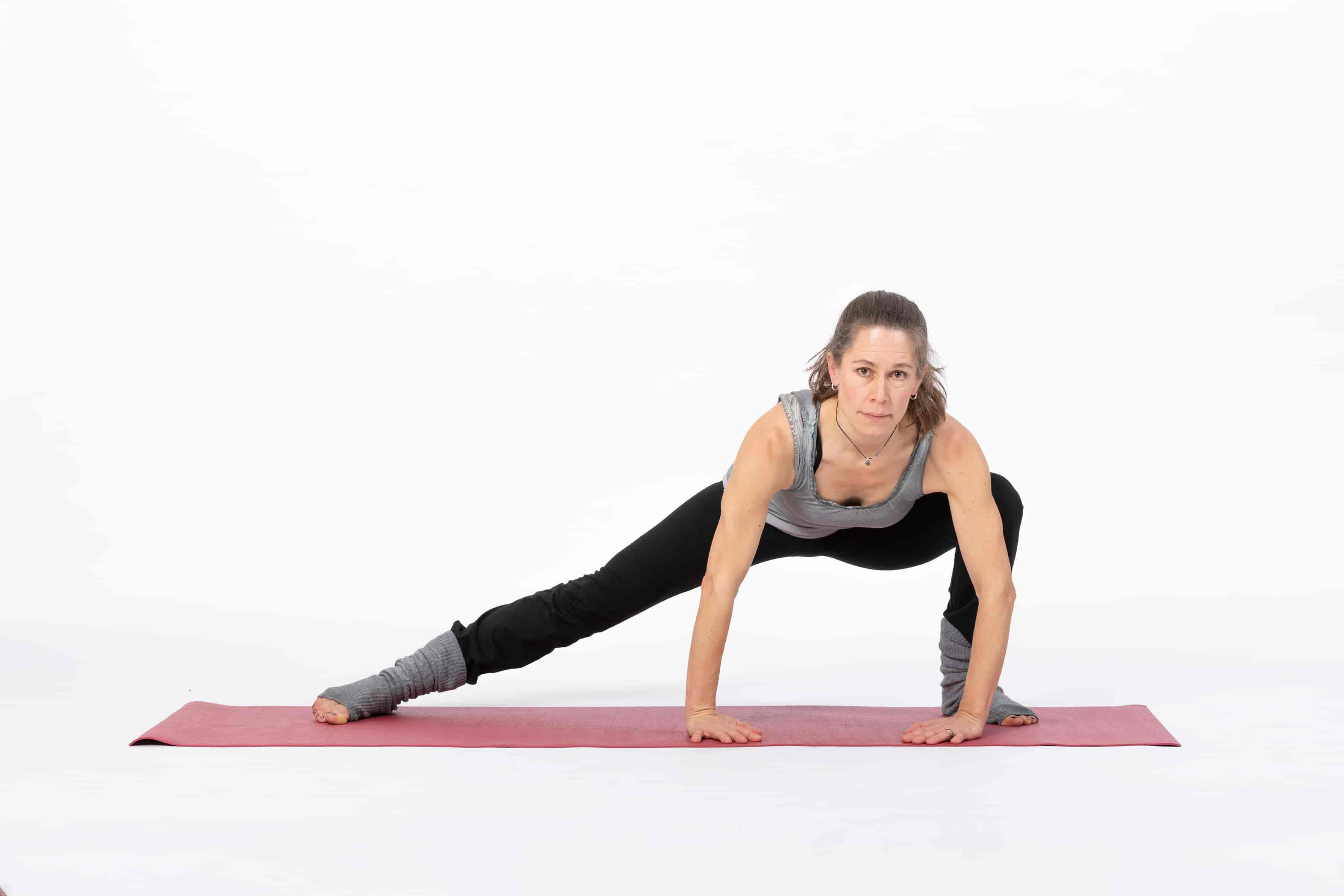 M Intensive Dehnung für Leiste und Hüftbeuger. Nimm eine tiefe Schrittstellung am Boden ein. Das Knie des hinteren Beins liegt am Boden. Stütze dich mit den Händen ab. Wenn deine Arme "zu kurz" sind, kannst du Yoga-Blöcke zum Stützen verwenden. Falls du keine Yoga-Blöcke hast, tut es auch ein dickes Buch oder etwas Vergleichbares. Stelle nun den Fuss des hinteren Beins auf und versuche das hintere Bein zu strecken indem du die Ferse nach hinten stösst. Je mehr du gleichzeitig dein Becken nach unten sinken lässt, desto intensiver wird die Dehnung.